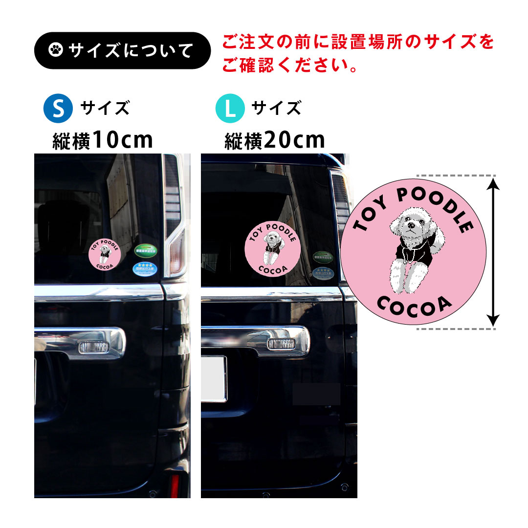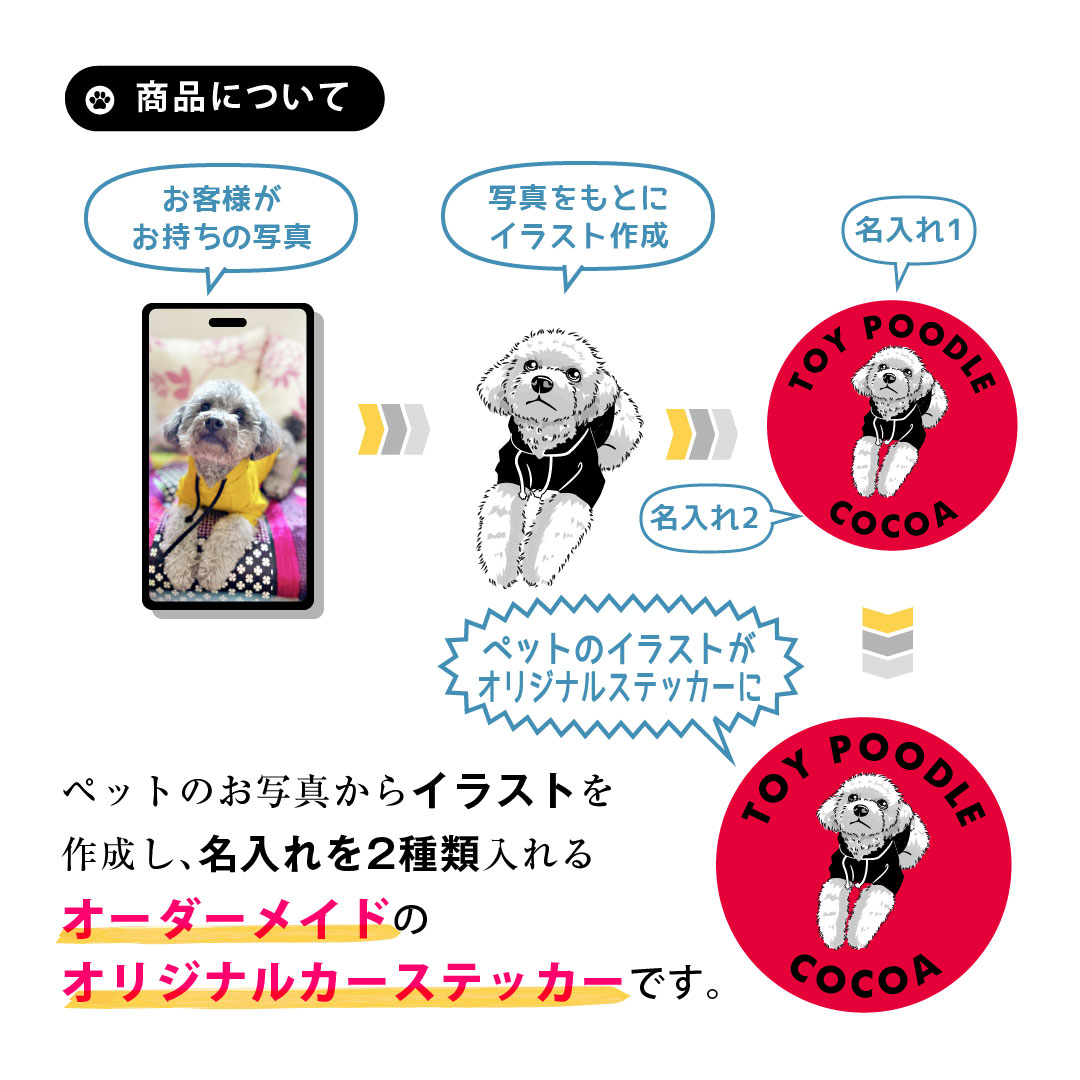 スマホやPCから送っていただいたペットのお写真をイラスト加工&名入れした、車に貼れるオーダーメイドのステッカーです。