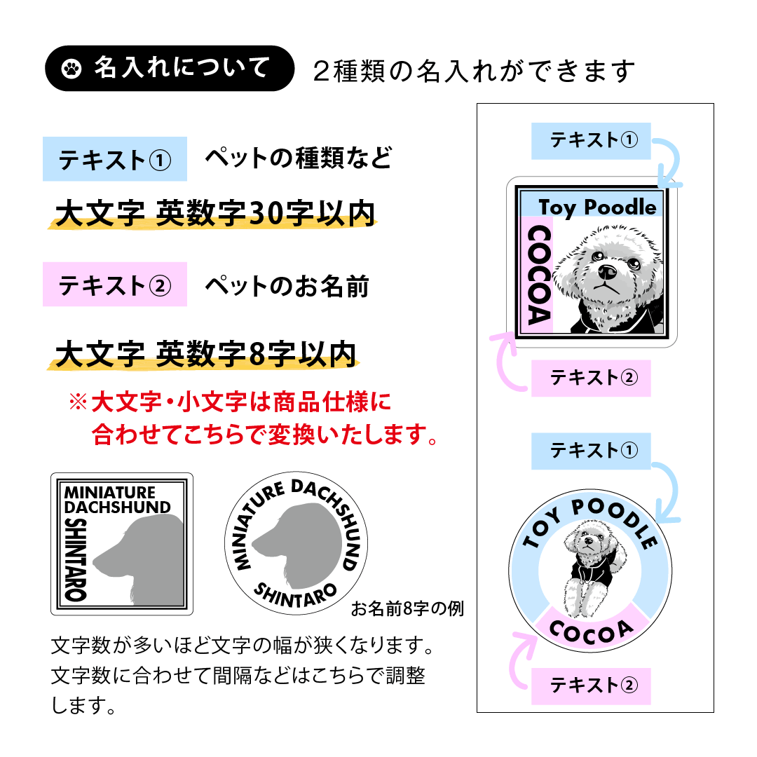 - 名入れ(半角英数字) : テキスト1:種類や生年月日など30文字以内